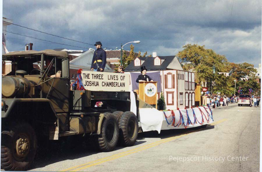 A color photo of Brunswick's 250th anniversary parade. The photo shows a float about Joshua L Chamberlain pulled by a military truck in front of the JJ Newberry Co. store on Maine Street. 10/07/1989