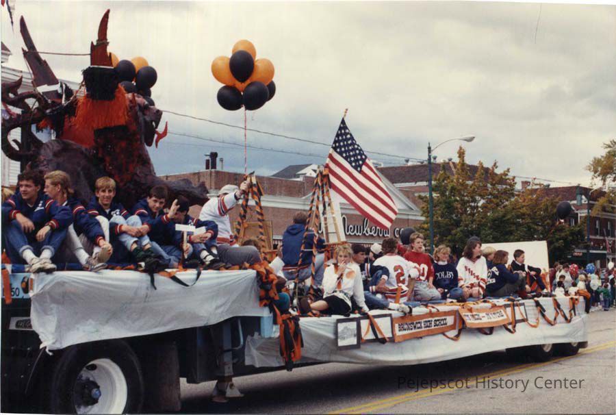 A color photo of Brunswick's 250th anniversary parade. The photo shows the Brunswick High School float on Maine Street in front of JJ Newberry's store. 10/07/1989
