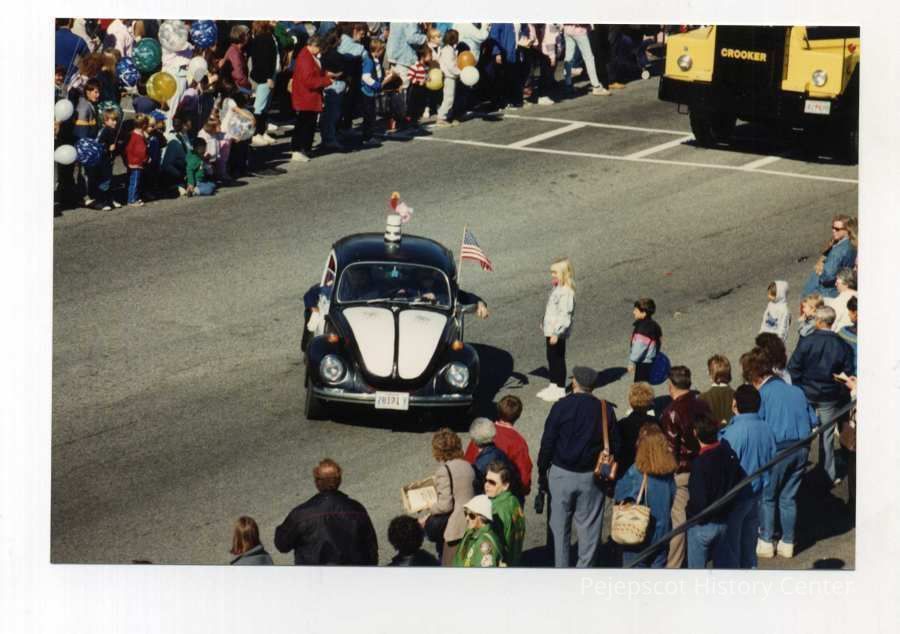 A color photo of Brunswick's 250th anniversary parade. The photo shows a black and white VW bug with an American flag attached to the side and colorful feathers on top of the roof. One of them men inside of the car is reaching out to a little girl from the crowd. 10/07/1989