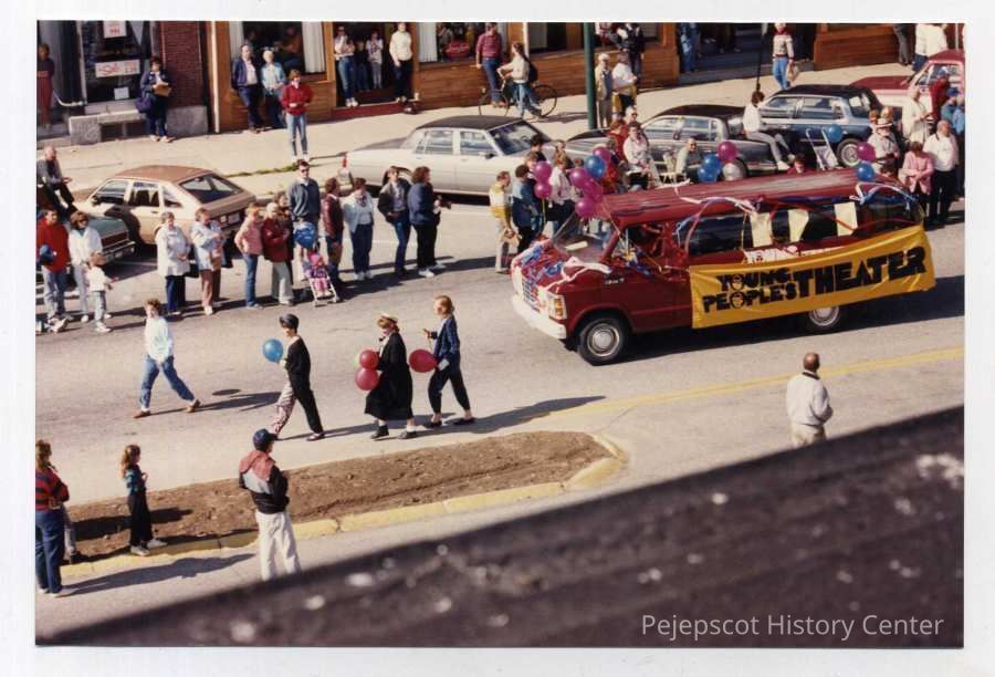 A color photo taken of Brunswick's 250th anniversary parade. The photo shows many people on Maine Street watching as three women holding balloons walk in front of a red van decorated with a banner reading "Young People's Theater" and multiple balloons and streamers. The photo looks to have been taken from the top of a building. 10/07/1989