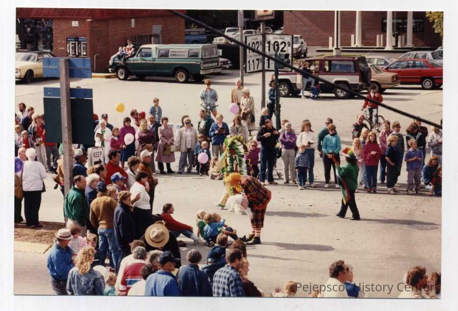 A color photo of Brunswick's 250th anniversary parade. Spectators look on as two people dressed in what seems to be Native American style garb walk down Maine Street. A person dressed as a clown entertains a group of three children. You can see the building that now houses 7-11 in the background. 10/07/1989