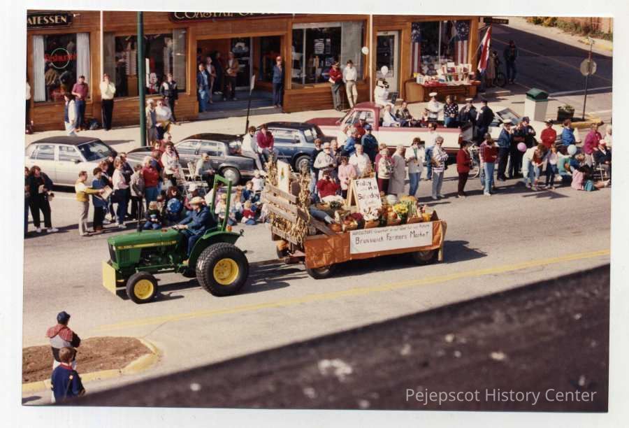 A color photo of Brunswick's 250th anniversary parade. The photo shows a tractor with a wagon full of produce. The sign on the side reads "Brunswick Farmers Market." Many spectators are also shown in the photo. 10/07/1989