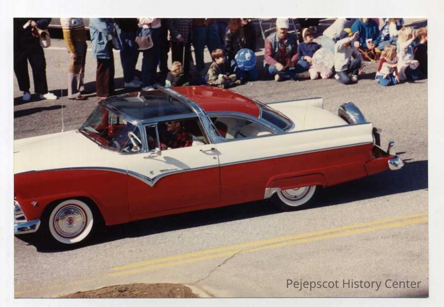 A color photo of Brunswick's 250th anniversary parade. The photo shows a man driving a red and white old fashioned car as onlookers watch.10/07/1989