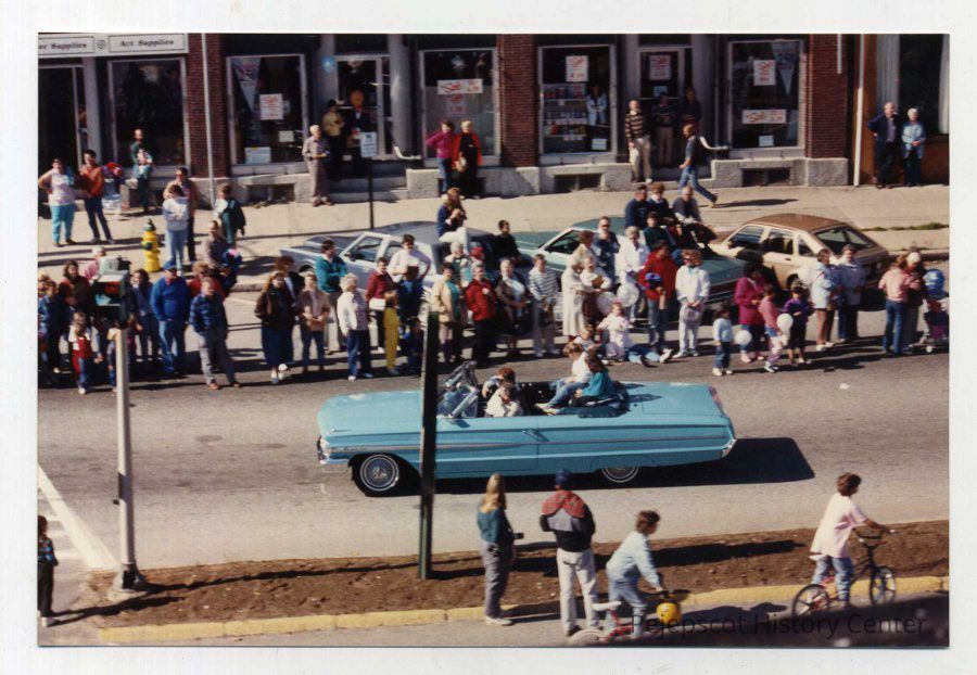 A color photo of Brunswick's 250th anniversary parade. The photo shows onlookers lining Maine Street as an aqua colored convertible drives by. 10/07/1989