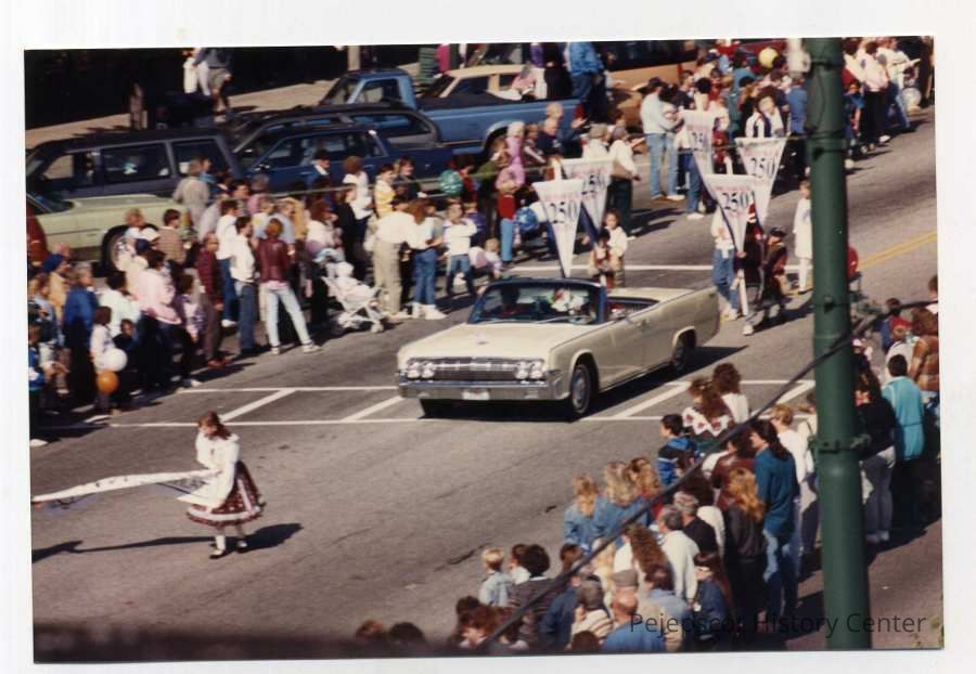 A color photo of Brunswick's 250th anniversary parade. The photo shows a gold colored antique car driving down Maine Street, followed by five people carrying banners that read "Brunswick 250 Years." 10/07/1989