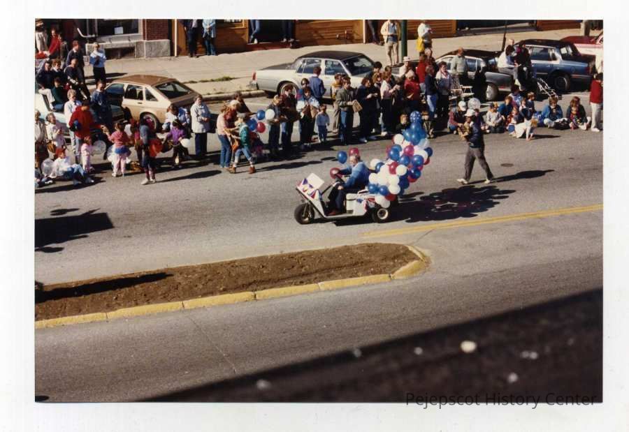A color photo of Brunswick's 250th anniversary parade. The photo shows a man driving a three wheeled vehicle with a number of balloons tied to the back, as another man walks behind him and the crowd looks on. 10/07/1989