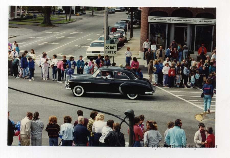 A color photo of Brunswick's 250th anniversary parade. The photo shows an antique car driving down Maine Street as a crowd of people watches. 10/07/1989