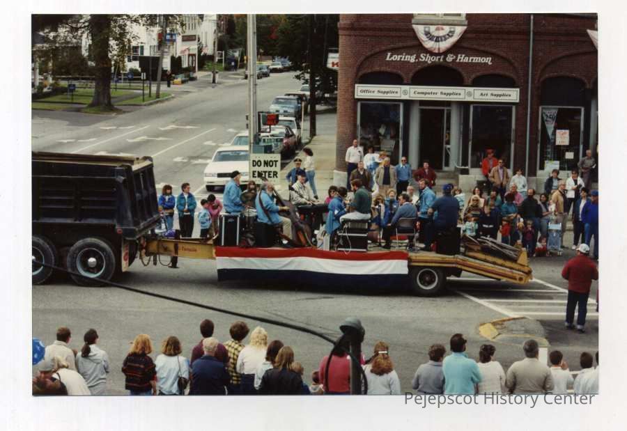 A color photo of Brunswick's 250th anniversary parade. The photo shows a band playing on top of a trailer bed being towed by a truck. The trailer bed is decorated with red, white, and blue bunting. The band includes a keyboardist, bassist, and drummer, as well as others. 10/07/1989Collection