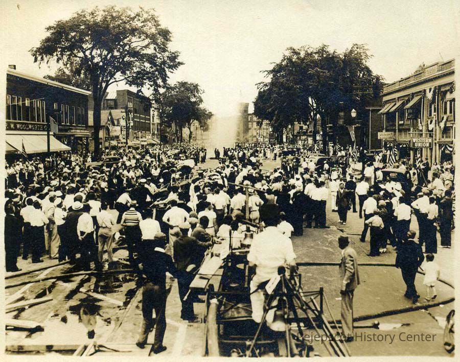 A black and white photograph of people on Maine Street in Brunswick during Brunswick's Bicentennial Parade (ME). Dated 1939.