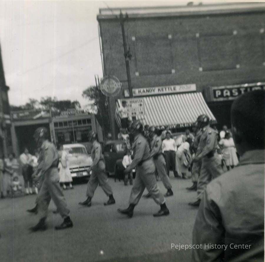 A black and white photograph of Brunswick's Memorial Day parade. The Kandy Kettle and Pastime Theater on Maine Street are in the background..