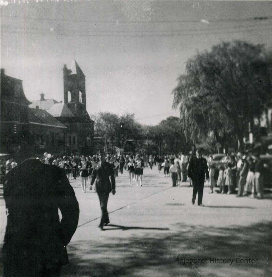Parades - Brunswick, Parades, Parades - Memorial Day, Memorial Day, Memorial Day Parade 1954, Streets - Maine Street, Old Brunswick Town Hall, Brunswick Town Hall