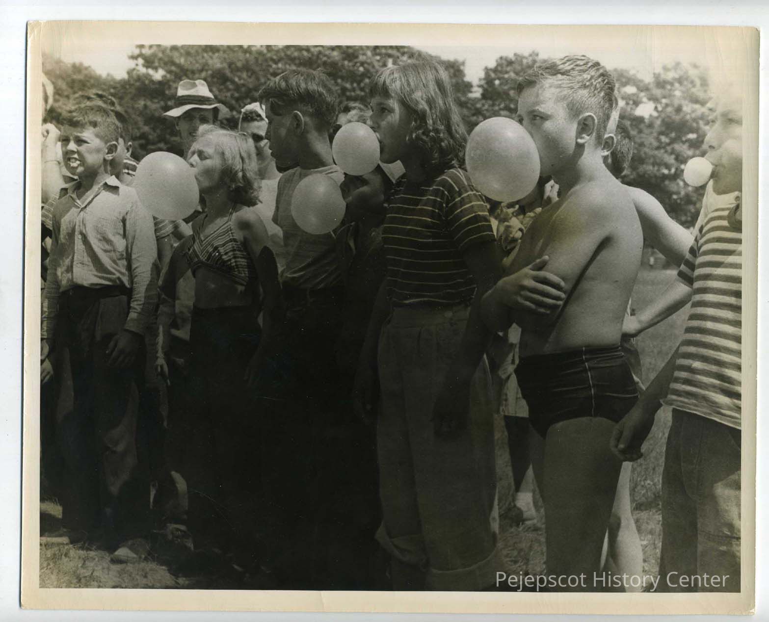 This shows a group of young people blowing bubble gum bubbles at the Verney Mill picnic. Maurice Michaud appears on the far left. Undated
