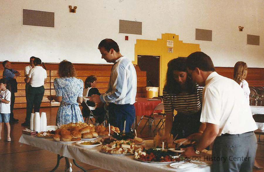 A color photograph of the buffet luncheon with Lee Lord, Ann Rowe and Mark Toussaint getting food.