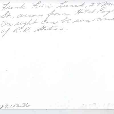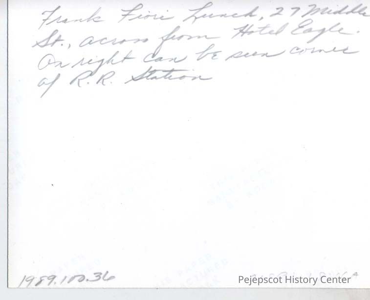 Photo of building at 27 Middle Street, Brunswick, Maine, Frank Fiori & Company, across from the Eagle Hotel. This is currently (2011) the site of the Hannaford Supermarket parking lot. The Maine Central Railroad Station can be seen in right background.Lexicon