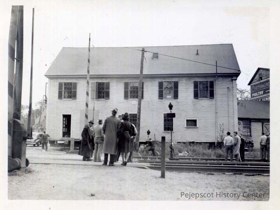 B/W photo of a building being moved on Maine Street, October, 6, 1940. Possibly the Melcher Building being moved from upper Park Row to Noble Street.