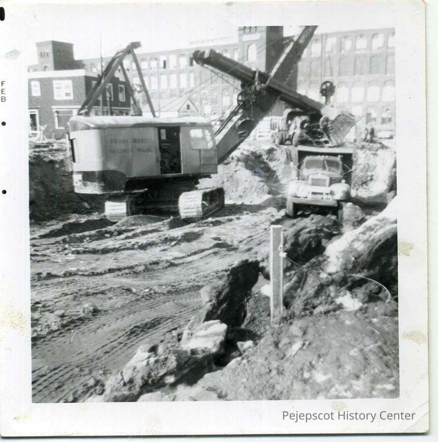 Black & white photograph of construction of Route 1 underpass, Brunswick, 1961. Intersection of Maine and Mill Streets.