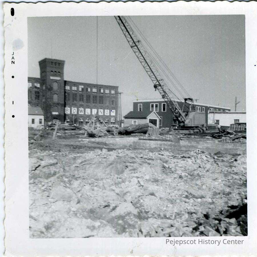 Black & white photograph of construction of Route 1 underpass, Brunswick, 1961. Fort Andross visible in background, with sign "Bowling" on front.