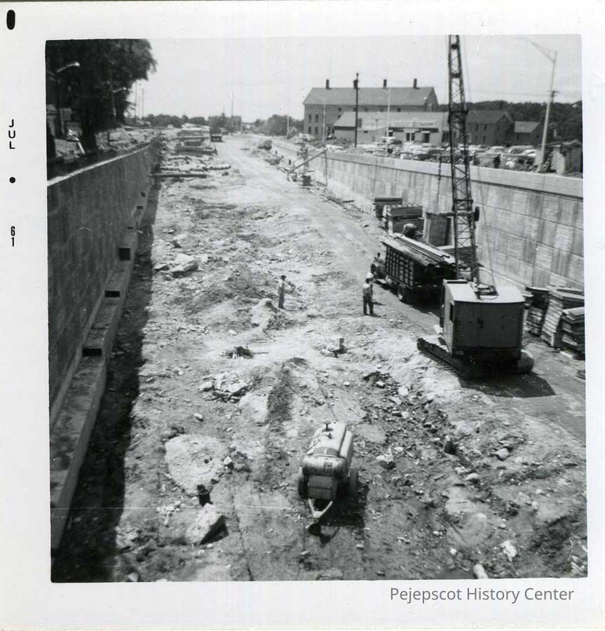 Black & white photograph of construction of Route 1 underpass, Brunswick, 1961.