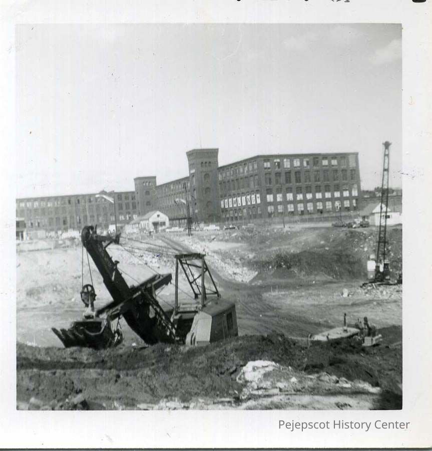 Black & white photograph of construction of Route 1 underpass, Brunswick, 1961. Whole of Fort Andross seen in background.