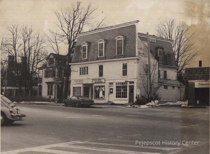A B/W photographic view of David Klickstein's building at 220-224 Maine Street right next to the Chamberlain Museum..