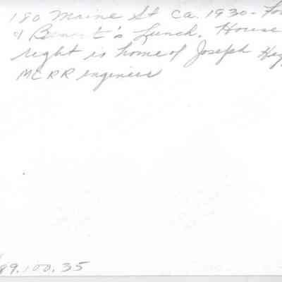 Photo of buildings at 180 Maine Street, Brunswick, Maine, around 1930. On left is Fortin's and Benoit's Lunch, on right is the home of Joseph Higgins, Maine Central Railroad (M. C. R. R.) engineer.Lexicon