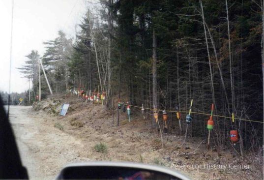 A photo of buoys on the side of Route 123 in front of a wooded area, placed there as part of a protest against a proposed liquified natural gas terminal in Harpswell. Locals opposed the development because they feared industrial activity in their backyards and that the project could harm fishing in the area, hence the buoys. A sign is in front of the buoys. The photo is shot from a car, with the side mirror appearing in the bottom of the frame.Collection