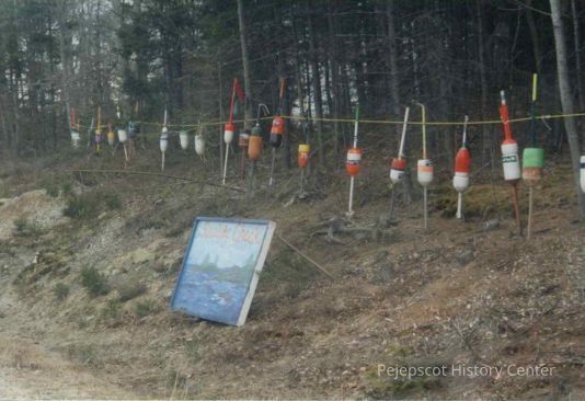 A photo of buoys on the side of Route 123 in front of a wooded area, placed there as part of a protest against a proposed liquified natural gas terminal in Harpswell. Locals opposed the development because they feared industrial activity in their backyards and that the project could harm fishing in the area, hence the buoys. A sign in front of the buoys says "Reality Check"Collection