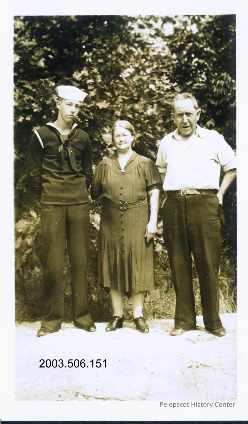 A black and white photograph of Clara and John Woodward and Bill Shaw was taken when Bill joined the Navy in 9/1941.