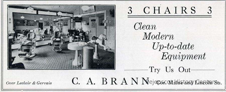 The advertisement reads: "3 Chairs" "Clean, Modern, Up-to-date Equipment" "Try us out" and "C.A. Brann" "Over Leclair & Gervais" "Cor. Maine and Lincoln Sts."