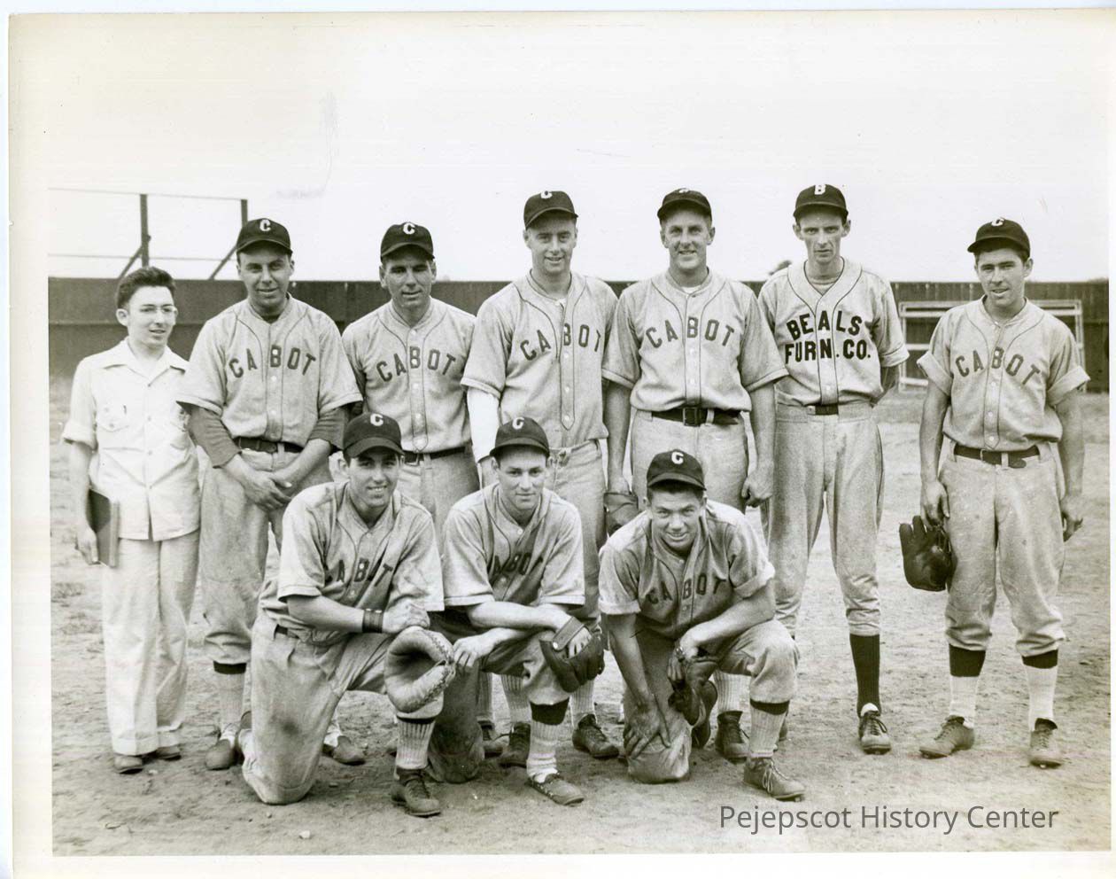 The Cabot Baseball Team. Back row; 1.) Claude St. Pierre, manager, 2.) ? Karkos, 3.) Dominic Paiement, 7.) Roger Fortin. Front row; 2.) Bob St. Pierre, 3.) Smiley Brilliant. Late 1930s or very early 1940s. UndatedLexicon