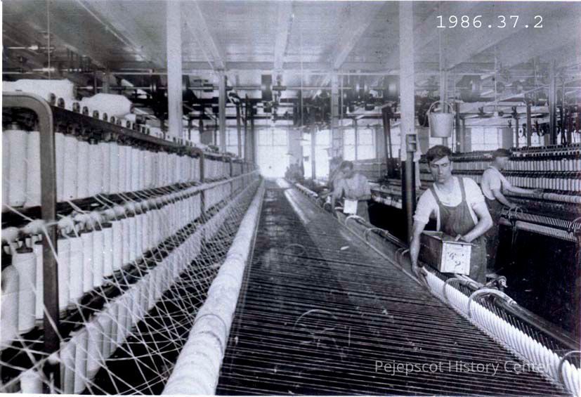 A B/W glossy photograph of Joseph Mathias Pelletier working in the mule spinning room at Cabot Manufacturing Co.