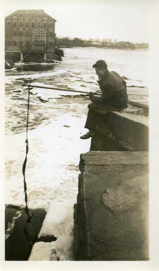 A black and white photo of an unidentified man sitting on rocks in the foreground with the Cabot mill across the river during the 1936 flood. Brunswick, Maine.