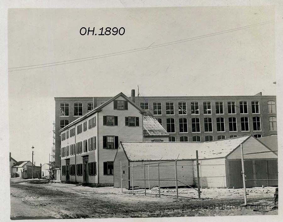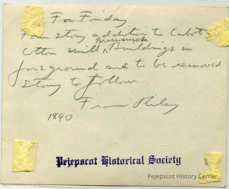 A B/W photograph of the Cabot Mill, Brunswick, ME. looking up Maine Street. Not dated.