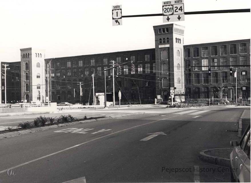 A B/W photograph of the Cabot Mill. The photo was taken from Maine Street. Undated