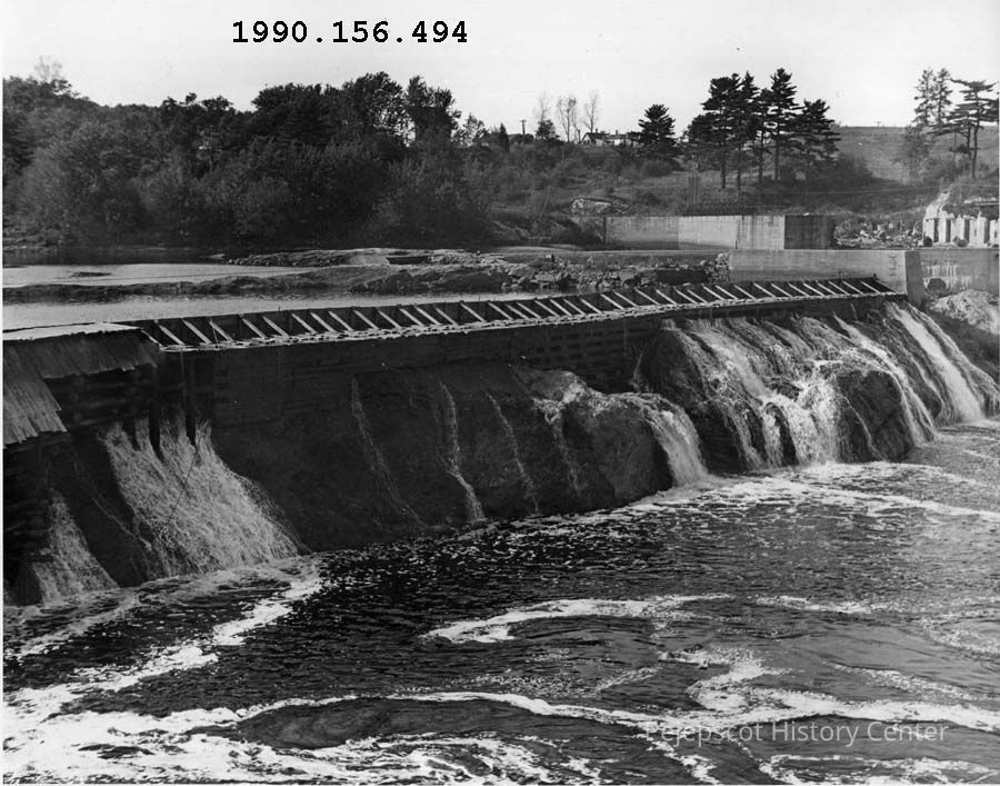 A B/W photograph of the dam at rear of Cabot Mill. Topsham Heights is in the background. Undated