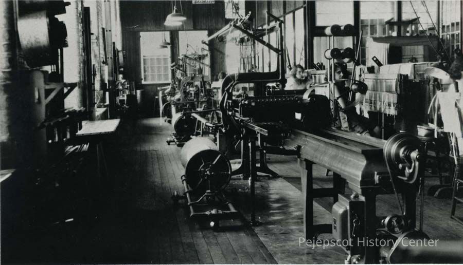 A B/W photograph of interior of Cabot Mill with 2 girls working at some machines. Brunswick, Maine. Undated.