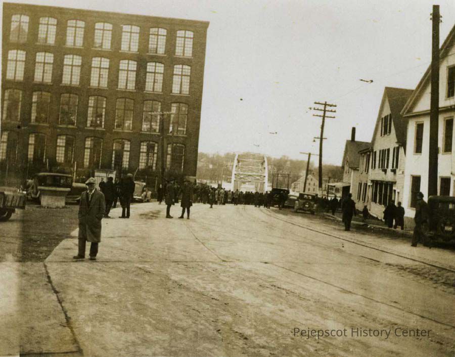 B/W photo of Cabot Mill and the north end of Maine Street, showing a large group of spectators looking at the flood of 1936. 1936.