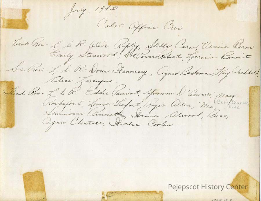A black and white photo of the Cabot Office Crew dated July, 1942. Brunswick, Maine. They are identified as follows: