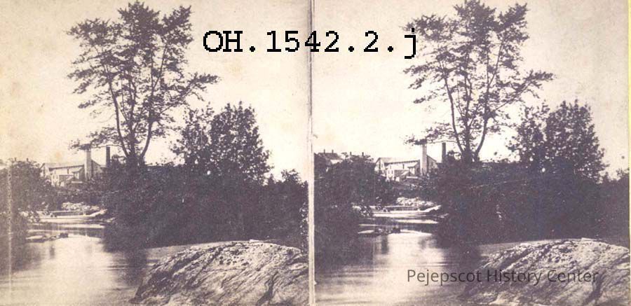 A B/W stereo view of, "Cotton Factory from Little Bridge, Topsham", ME. It is a view of mostly of brush and water. The mill can just be seen in the distance. Undated