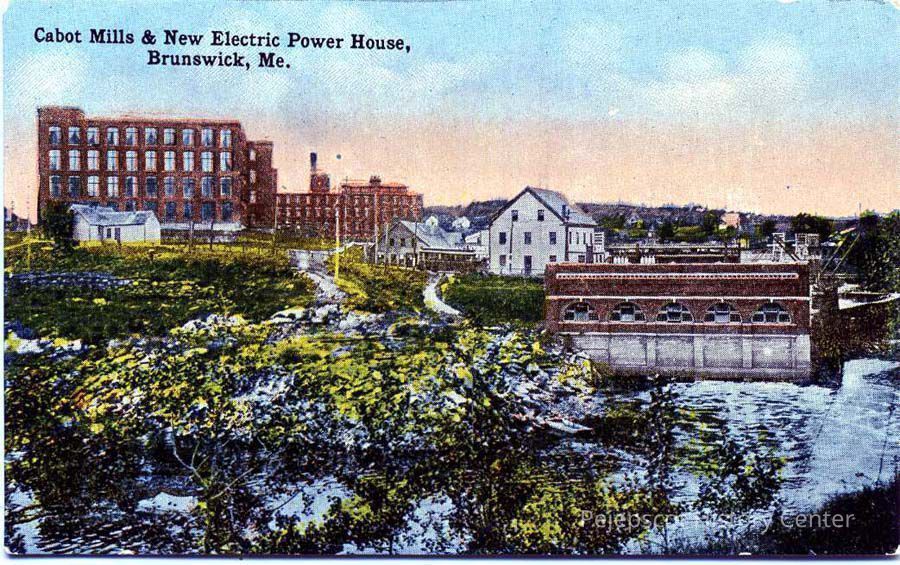 Miniature color postcard of Cabot Mills and the new Electric Power House.
