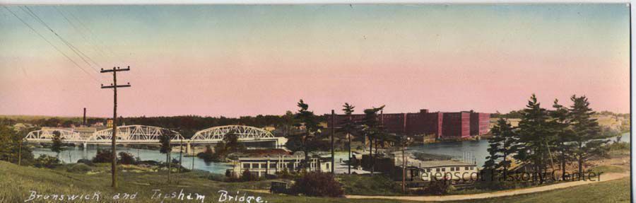 Panoramic photo of Cabot Mill and Frank J. Wood Bridge, Brunswick, Maine, from the Topsham side of the Androscoggin River. 2-3/4"x8-1/2"