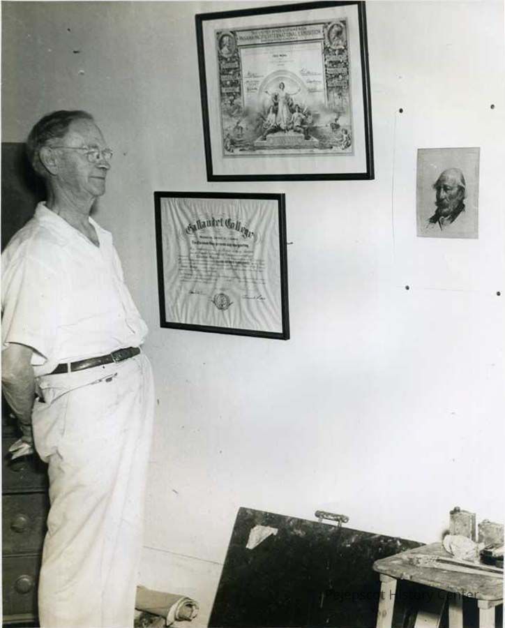 A B/W photographic view of Cadwallader Washburn, noted painter with some of his awards and a painting. Undated