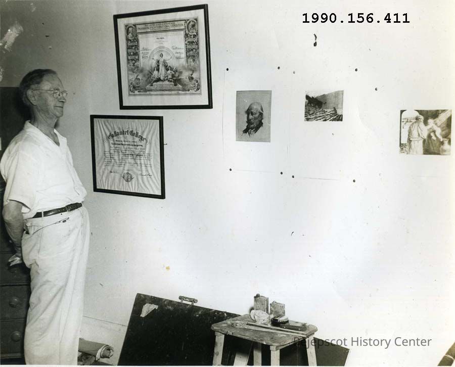 A B/W photograph of Cadwallader Washburn with some of his paintings. Undated