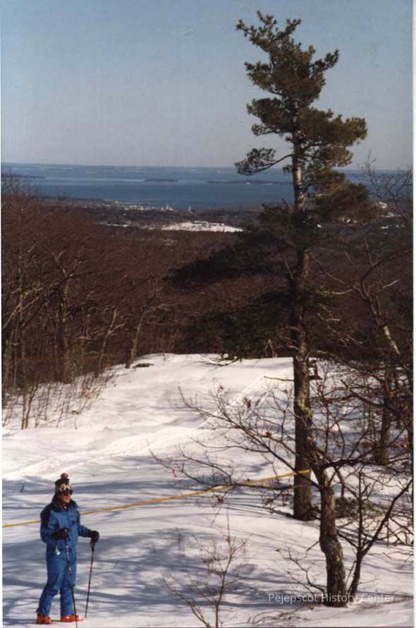 A color photo of an unidentified skier at Camden Snow Bowl with Penobscot Bay in the background probably was taken in February 1993.