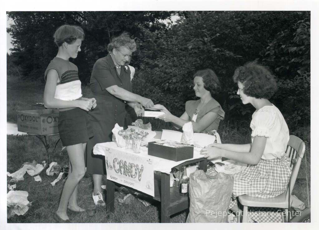 Willa Schmidt (Delan, FL) and Rebecca Longley (Barre, MA) sell candy to Ellen Booker and Mrs. Ruth Cadieux at the Birch Island Auction on July 28, 1951.