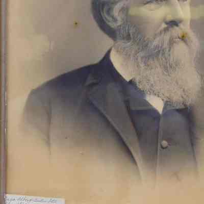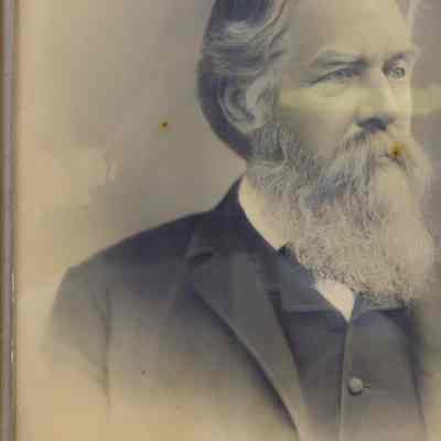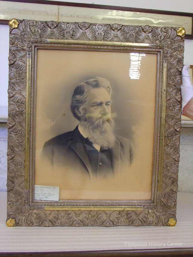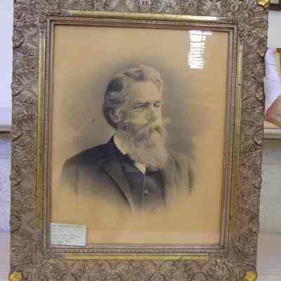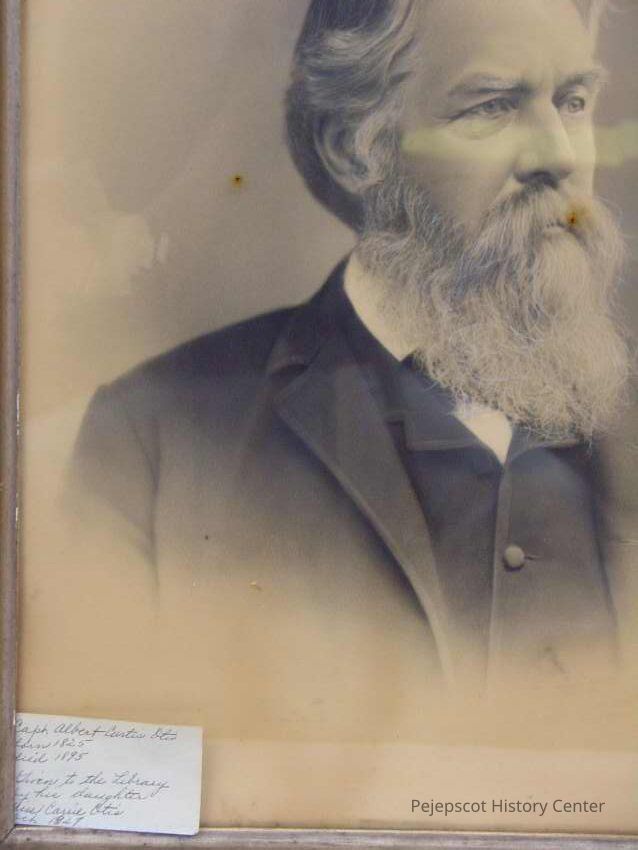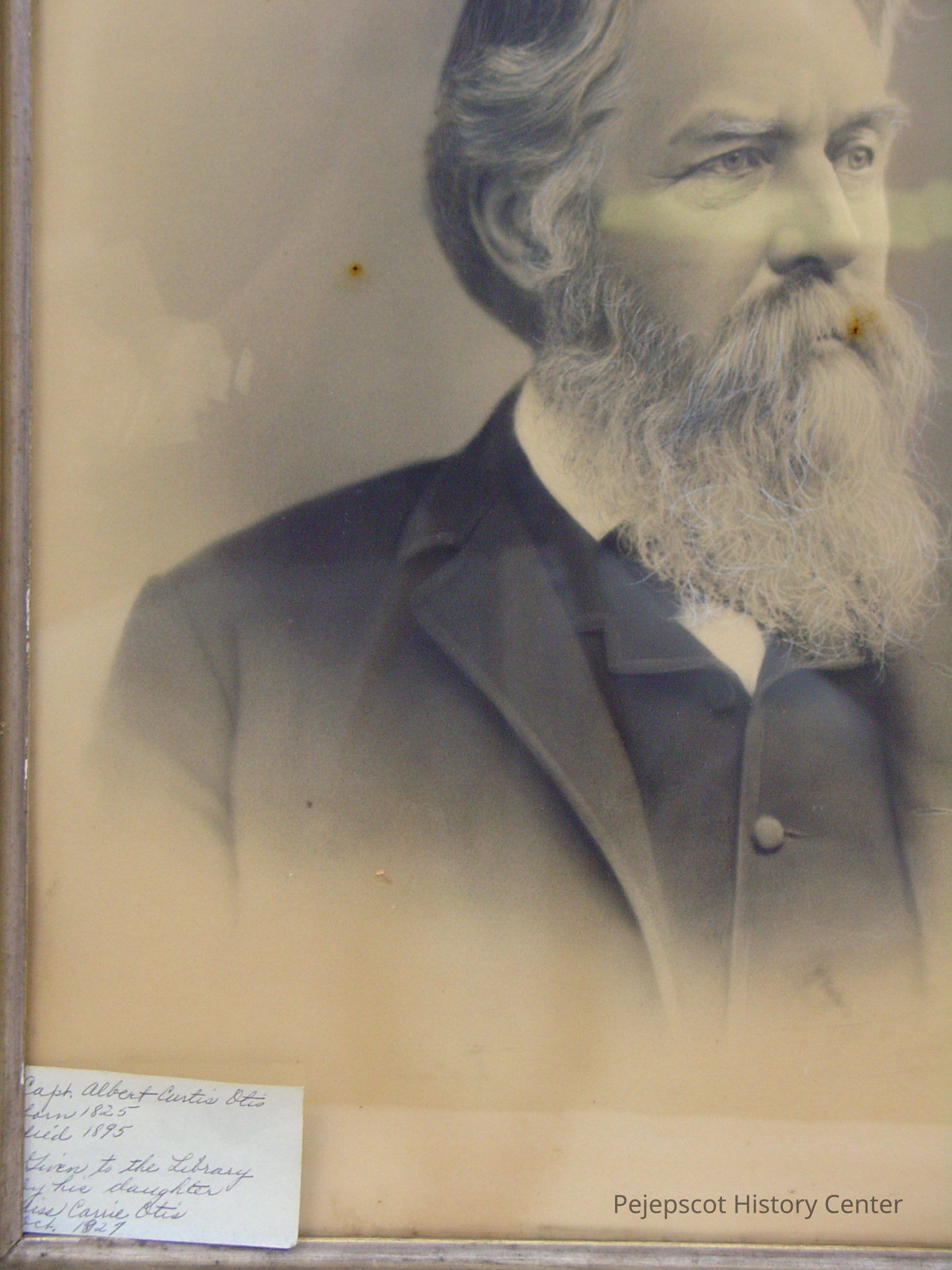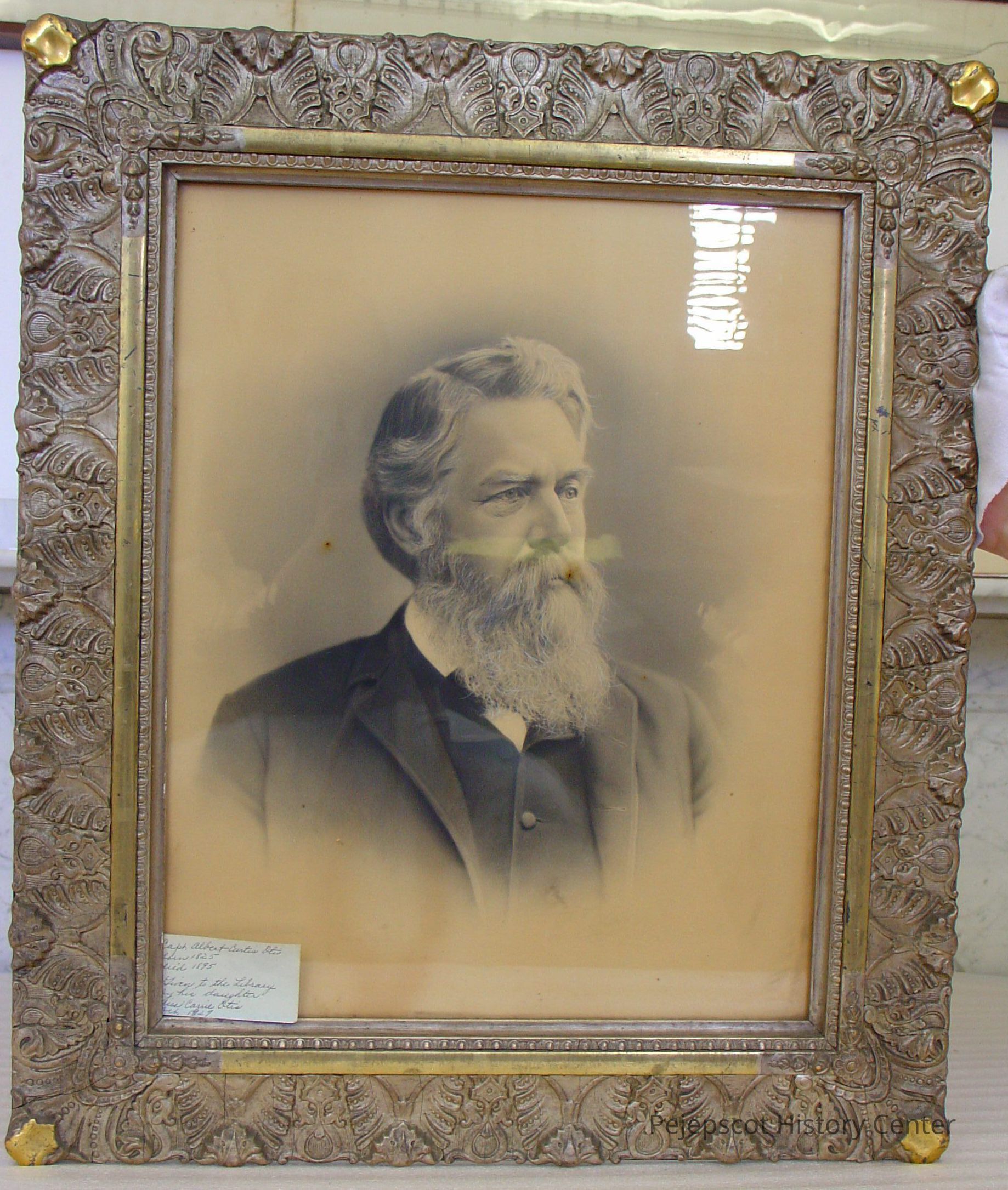 Framed B&W photo of Capt. Albert Curtis Otis. A hand written note glued to the back: ""Capt. Albert Curtis Otis Born 1825 Died 1895 Followed the Sea 51 years." Added later, "Given to the library by his daughter, Mrs. Carrie Otis October 1927." Wide wood frame with molded plaster of silver with gold at corners and on a narrow center strip. Overall size: 67.75 cm h x 57.75 cm w x 2.5 cm d. Photo not dated.