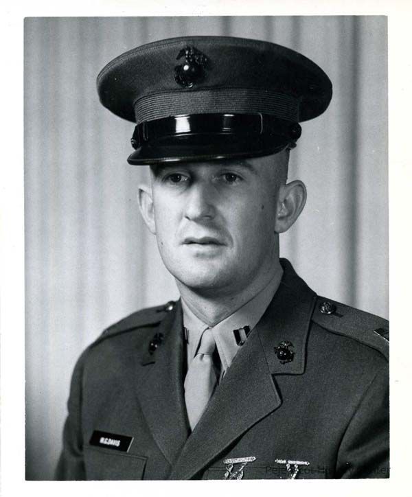 Head and shoulders portrait of Lt. Capt. Davis USMC, Marine Barracks. The back is stamped "U.S. NAVAL AIR STATION BRUNSWICK, MAINE AH 1629-10-63 OFFICIAL U.S. NAVY PHOTOGRAPH NOT FOR PUBLICATION UNLESS OFFICIALLY RELEASED." Undated