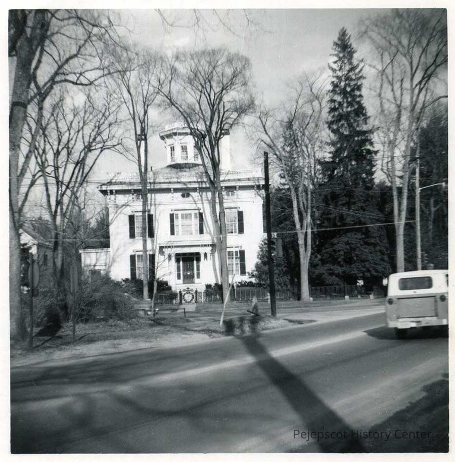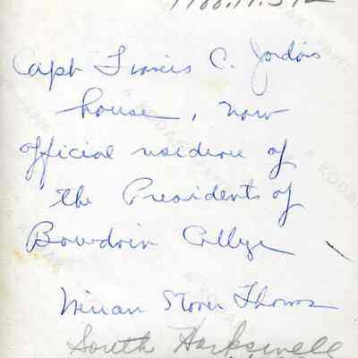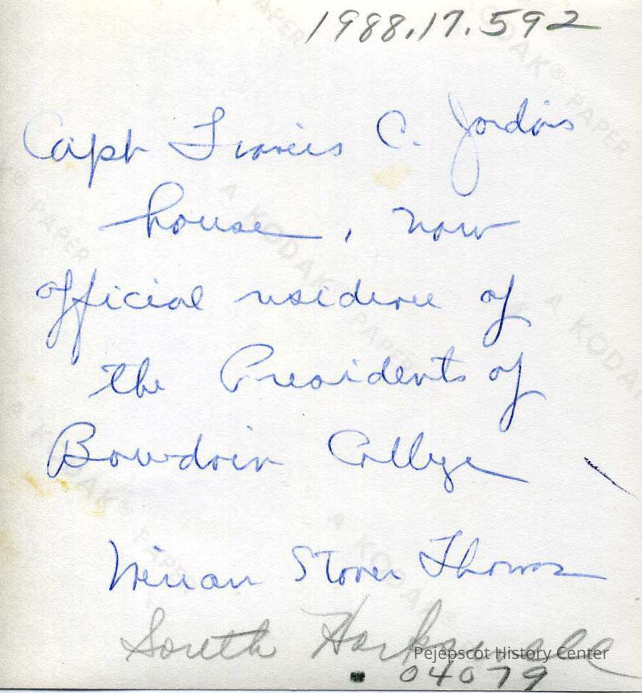 An undated black and white photograph of the Capt. Francis C. Jordan house at the corner of Federal Street and Bath Road. Miriam Stover Thomas, who donated the photograph in 1988, states on the back that it was currently (at the time of its donation) the official residence of the President of Bowdoin College. The house is currently owned by Bowdoin College and used as offices.