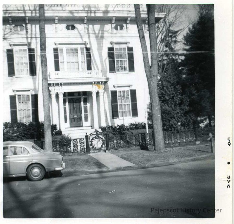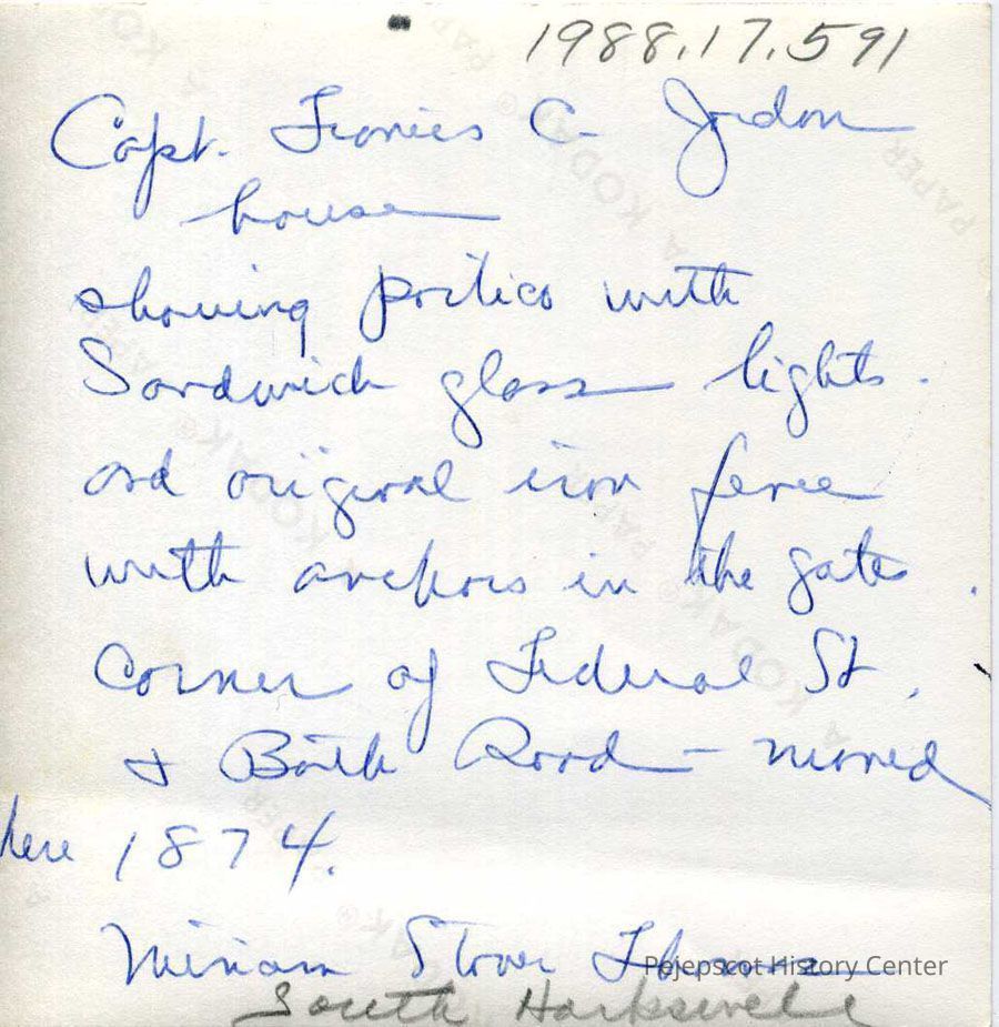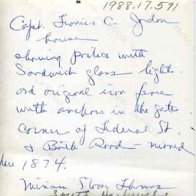 A black and white photograph of the Capt. Francis C. Jordan House on the corner of Federal Street and Bath Road in Brunswick. The writing on the back by Miriam Stover Thomas states that the photograph shows the portico with Sandwich glass lights and the original iron fence with anchors in the gate, and that the house was moved to this location in 1874. It is currently owned by Bowdoin College and used as offices.