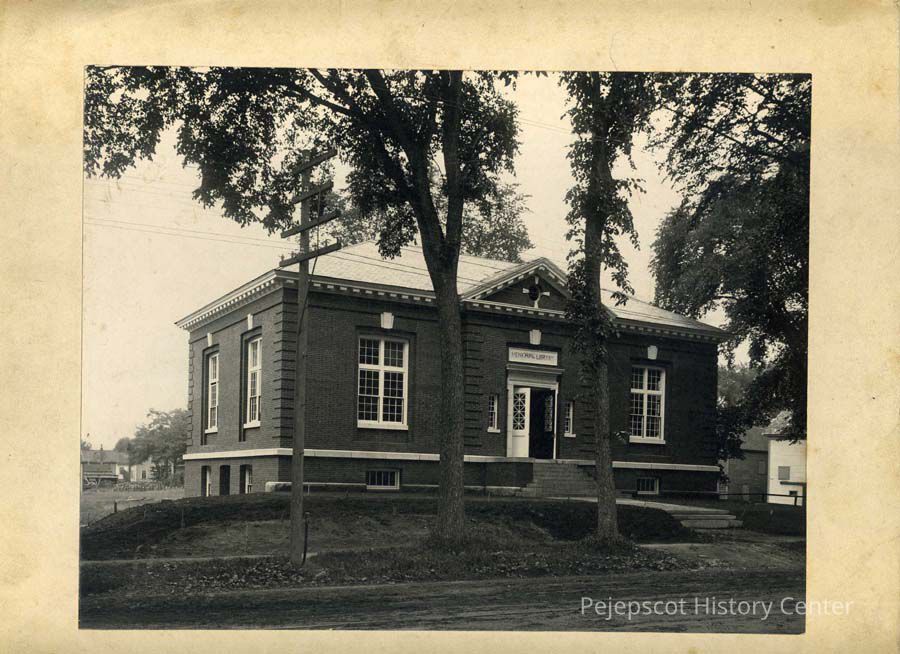 A black and white mounted photograph of the Capt. John Curtis Memorial Library, Brunswick, ME as the building is about to be dedicated. Dated 1904.
